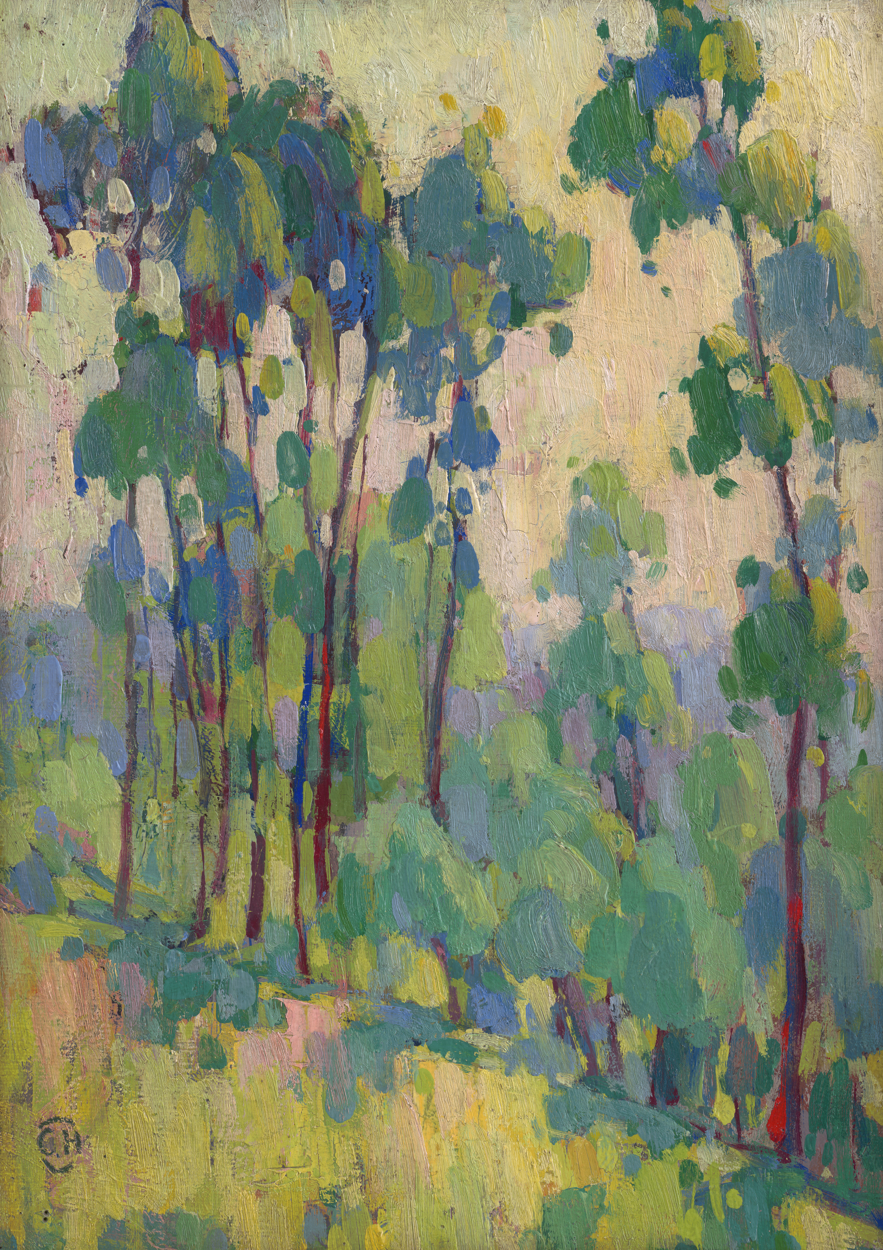 Wie nebeneinandergesetzte Mosaiksteine tupft Curt Herrmann die leuchtend grünen, bauchig runden Pinselstriche locker auf den Bildträger. Im sanften Licht des Sonnenaufgangs stehen die teils roten oder blauen, linearen Baumstämme deutlich im Kontrast zu Buschwerk und Baumkronen. Fast schon abstrakt wirkt die spontane, in sich schlüssige Komposition mit der schräg angedeuteten Lichtung im Vordergrund. Es wird wohl eine spätere Arbeit Herrmanns sein, der als einer der deutschen Neoimpressionisten gilt. Den Landschaftsausschnitt wählte er vermutlich in Pretzfeld, nördlich von Forchheim in der fränkischen Schweiz, wo die Familie seiner Frau ein Schloss besaß und er ab 1919 bis zu seinem Tod lebte und arbeitete.