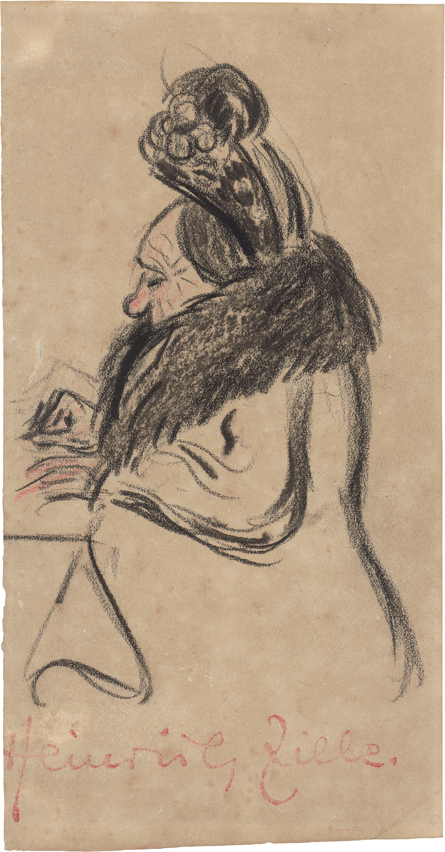 Mit energischem Strich skizziert Zille eine alte Dame am Tisch sitzend, mit üppigem Pelzkragen, der das faltige aber wohl zurecht gemachte Gesicht dahinter nur erahnen lässt.