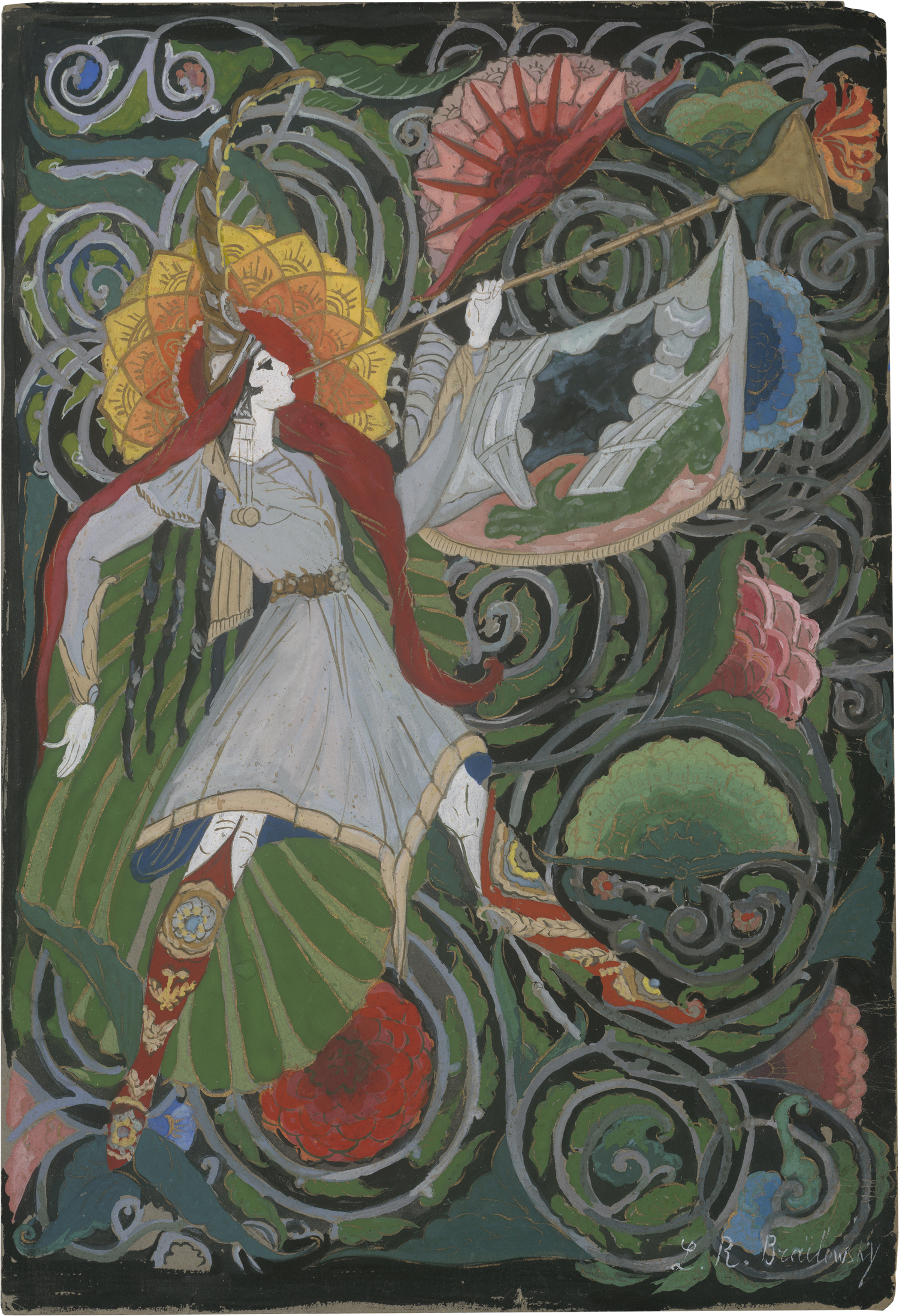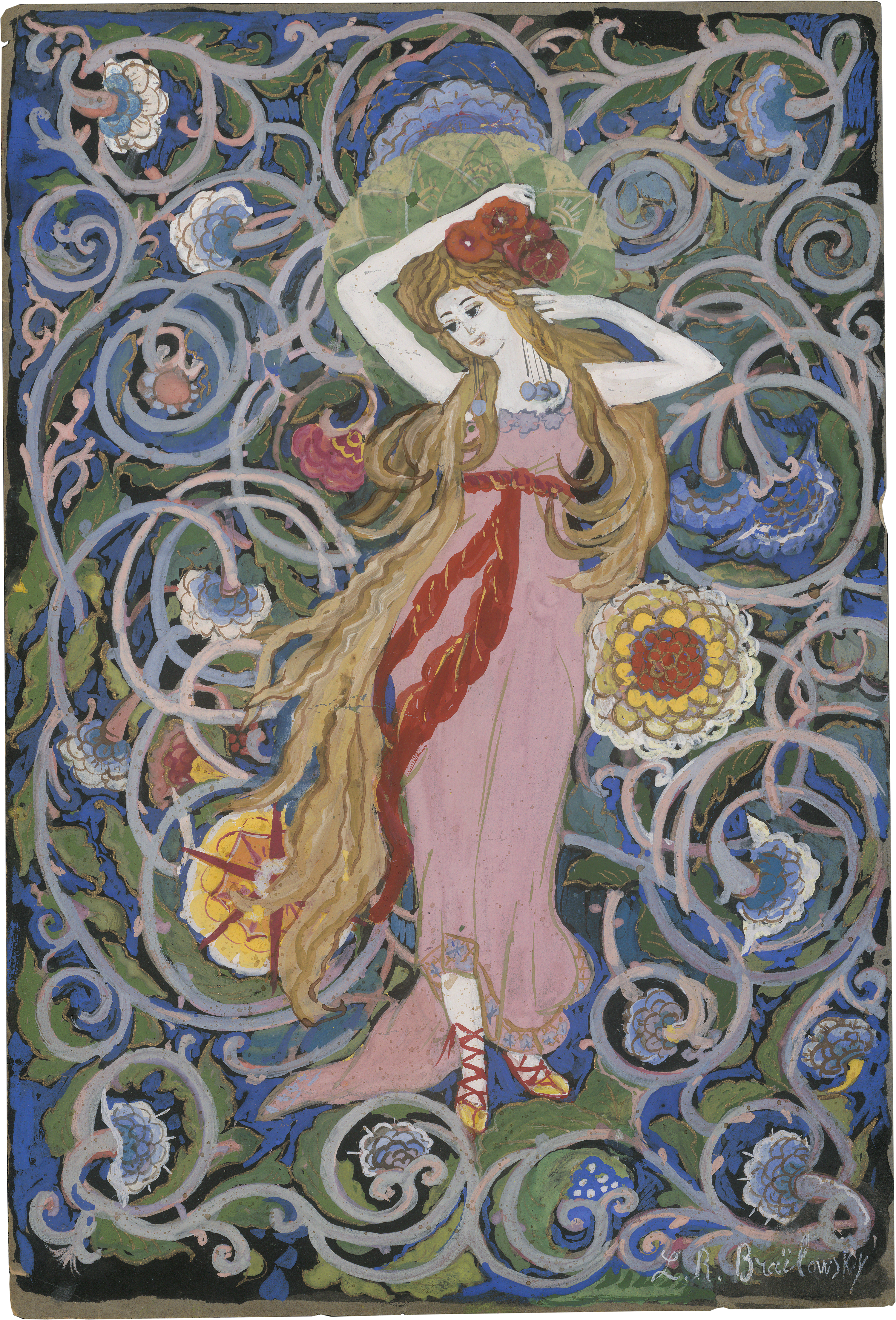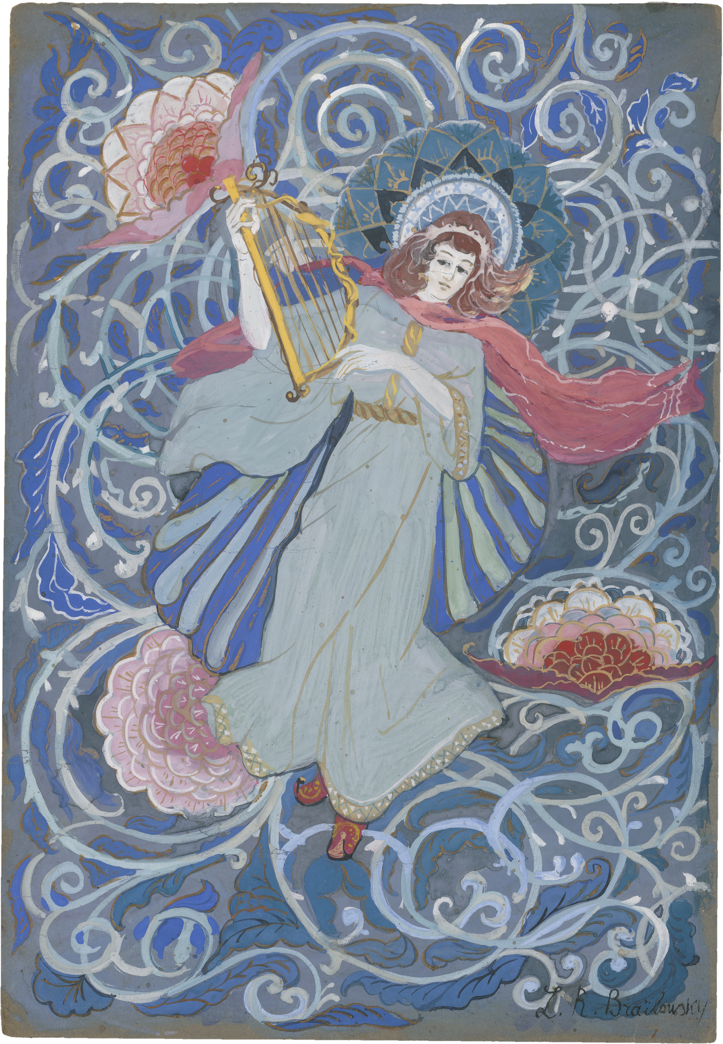 Die ornamentalen, dekorativen Kompositionen im russischen Jugendstil zeigen Frühling, Sommer, Herbst und Winter und sind ein gemeinsames Werk des Künstlerpaares Rimma und Leonid Brailovsky, die ein gemeinschaftliches Studio betrieben. Sie heirateten 1898, emigrierten 1919 nach Lettland, lebten in Konstantinopel und Belgrad und übersiedelten 1925 nach Rom, wo sie auch für den Vatikan tätig waren. Leonid wirkte als Architekt, Bühnenbildner und Designer und lehrte in Moskau ab 1898 Architektur an der Lehranstalt für Malerei, Bildhauerei und Baukunst sowie an der Moskauer Stroganov-Schule. Ab 1909 war er überwiegend als Bühnenbildner tätig, bevor er nach der Oktoberrevolution mit seiner Frau das Land verließ. Rimma war Künstlerin, Textilgestalterin und Designerin und lehrte um 1900 ebenfalls an der Stroganov-Schule. Die vier kleinen Papierarbeiten können sicher als Entwürfe für Gemälde oder Email-Arbeiten gewertet werden. Sie sind der Expertin für russische Graphik des 19. und 20. Jahrhundert, Olga Glebova, bekannt.