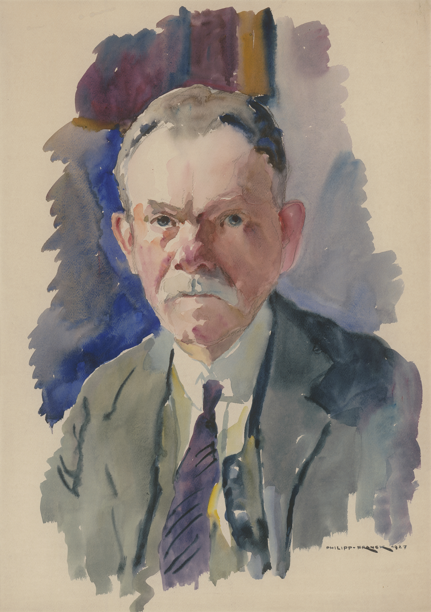 Großzügig und in hellen, transparenten Farben gearbeitetes Aquarell. Die lebendigen Strukturen im Hintergrund in klaren, schön differenzierten und kräftigeren Blau- und Violetttönen bilden einen schönen Kontrast zum ernsthaften Ausdruck des Künstlers. Philipp Franck ließ sich an der Städelschule in Frankfurt, in der Malerkolonie Kronberg im Taunus und an der Düsseldorfer Kunstakademie ausbilden. Von 1892 bis zu seiner Pensionierung 1930 war er Pädagoge und zeitweise Direktor an der Staatlichen Kunstschule Berlin. Er war der Berliner Kunstszene eng verbunden, gehörte zu den Mitbegründern der Berliner Sezession und war auf deren Ausstellungen regelmäßig vertreten.