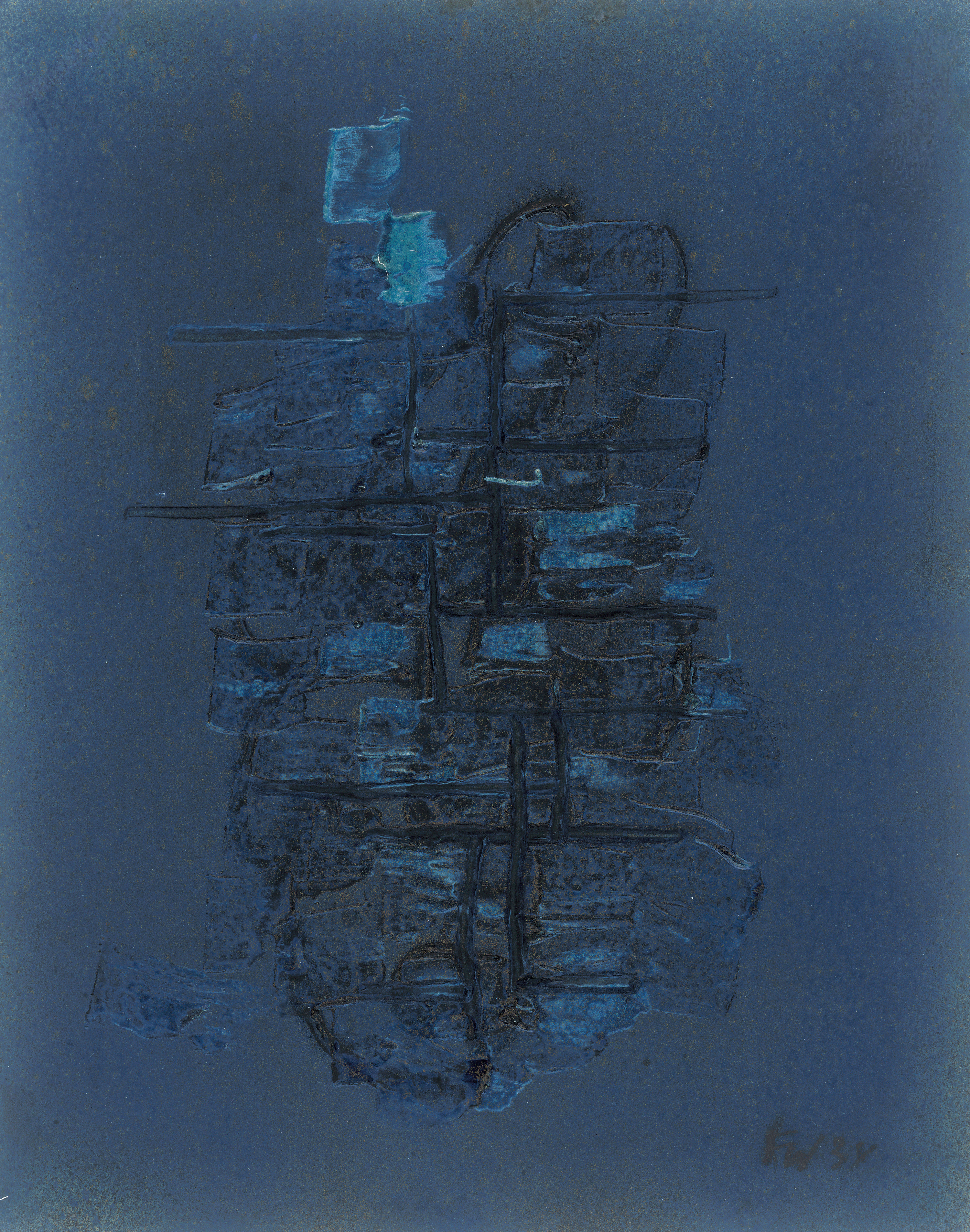 Aus der Tiefe des nachtblauen Untergrundes entwickelt sich die oval-längliche, weitgehend in sich geschlossene Form kristalliner Strukturen. In die pastos-dicken Farbstrukturen kratzt Winter labyrinthartig verschachtelte, teils winklig-gerade, teils kurvige Furchen, und dann wieder legt er die Farbe reliefhaft in linearen dicken Schwüngen auf den Malgrund. Ein ganz feines Schimmern der Goldbronze akzentuiert die Kanten und verleiht der Zeichnung die stille, entrückte Anmutung eines nächtlichen Himmels. Mit einer Expertise von Gabriele Lohberg, Trier, Oktober 2019.