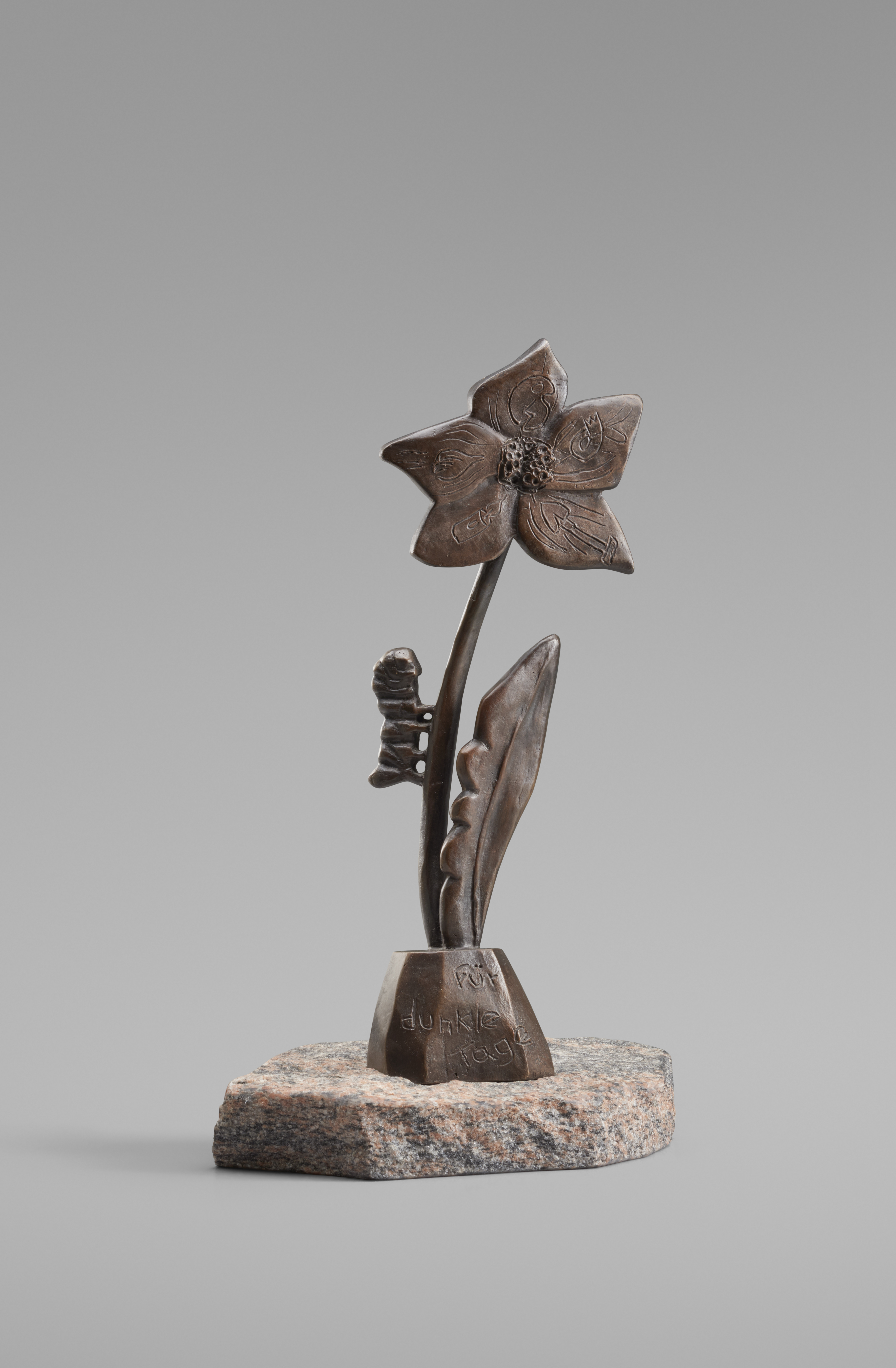 Die Raupe als Sinnbild der Metamorphose, des Übergangs zum Schmetterling und damit ein Zeichen der Hoffnung wandert den Stiel empor zur Blüte, die wiederum mit symbolhaften Zeichen geschmückt ist. Den Entwurf für die Bronze schuf Jörg Immendorff 1968 in einer Phase tiefer Depression, die Auflage wurde 2003 zugunsten der Hilfsorganisation "Ärzte ohne Grenzen" gegossen. Prachtvoller Guss mit schöner, gleichmäßiger Patina. Gesamthöhe mit Sockel: 43 cm.