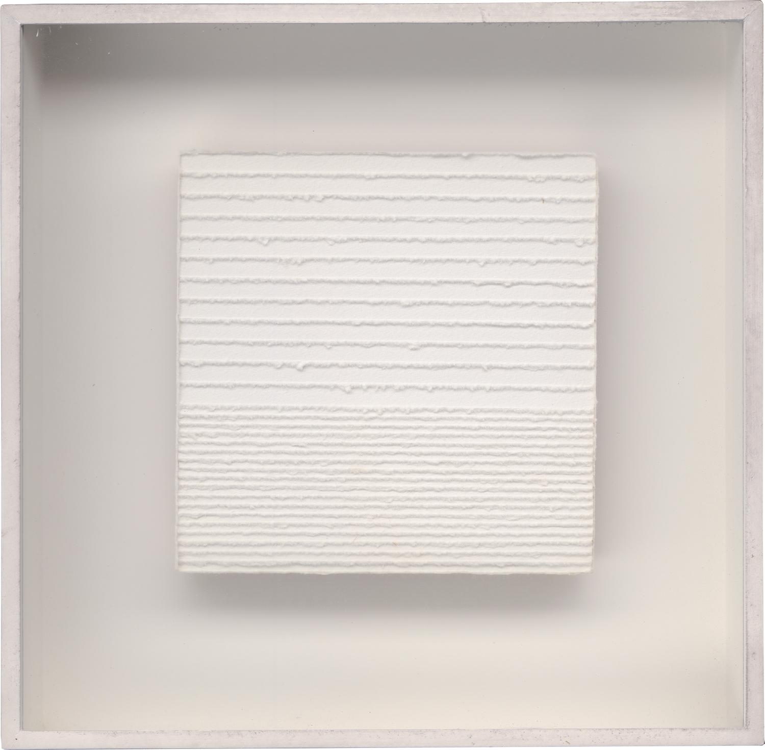 Die Stege im Papierblock verleihen dem Linienbild mit ihrer samtig-wattigen Erscheinung einen intensiv stofflichen Charakter. Leo Erbs Gesamtwerk ist von zwei Elementen bestimmt, die zu seiner "Handschrift" wurden und ihm zu internationalem Erfolg verhalfen: die Farbe Weiß und die Linie. Seit 1947 fertigte der saarländische Künstler seine ersten linearen Papierschnitte und Linienzeichnungen. In Saarbrücken studierte er bei Boris Kleint, einem Vertreter der Bauhauslehre, mit dem er später die "neue gruppe saar" gründete. Sein künstlerisches Schaffen umfasst mehr als sechs Jahrzehnte, und viele seiner Arbeiten sind in nationalen und internationalen Museen und Galerien ausgestellt. 1977 nahm er an der 6. documenta in Kassel teil.
