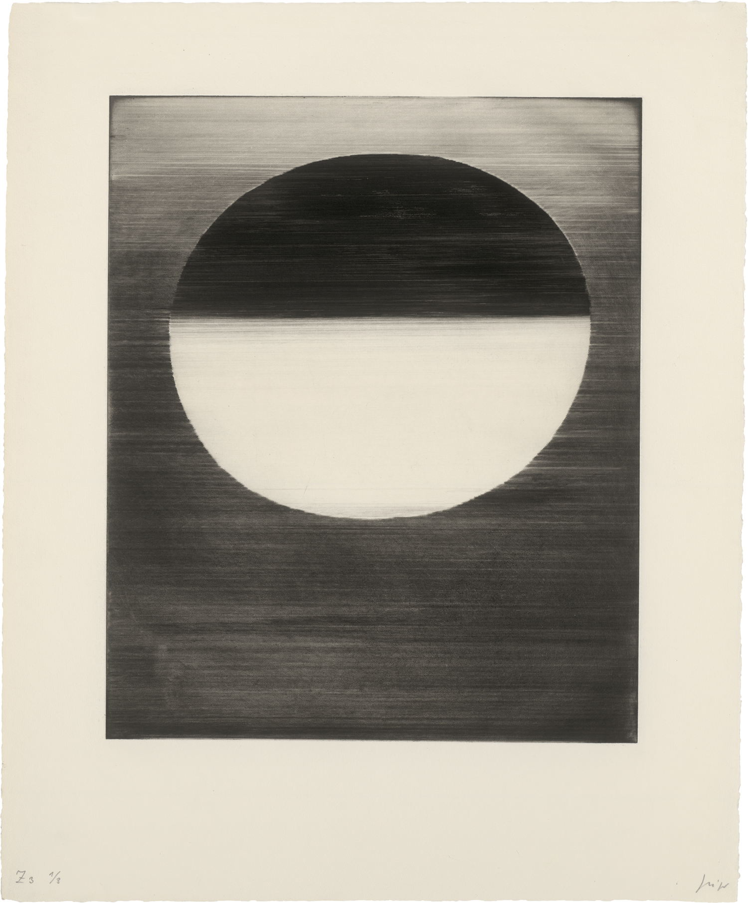 Folge von vier Kaltnadelarbeiten, alles Exemplare außerhalb des in einer Auflage von 22 numerierten, signierten Exemplaren erschienenen Mappenwerks "Rupprecht Geiger - Vier Radierungen". "In den 60er Jahren tritt die Form und ihre kompositionelle Verknüpfung zunehmend hinter der Dominanz der Farbe zurück. (...) Die Radierungen, denen Geiger mit Roulette und Lineal die differenziertesten Grauschattierungen abgewinnt, erlauben die Konzentration auf ein wesentliches, durch den Lichtcharakter bedingtes Farbmoment: Die Hell-Dunkel Wirkung." (Heinz Schütz, aus dem Text zur Mappe). Sämtlich prachtvolle, nuancenreiche Drucke mit dem vollen Rand. Sehr selten.