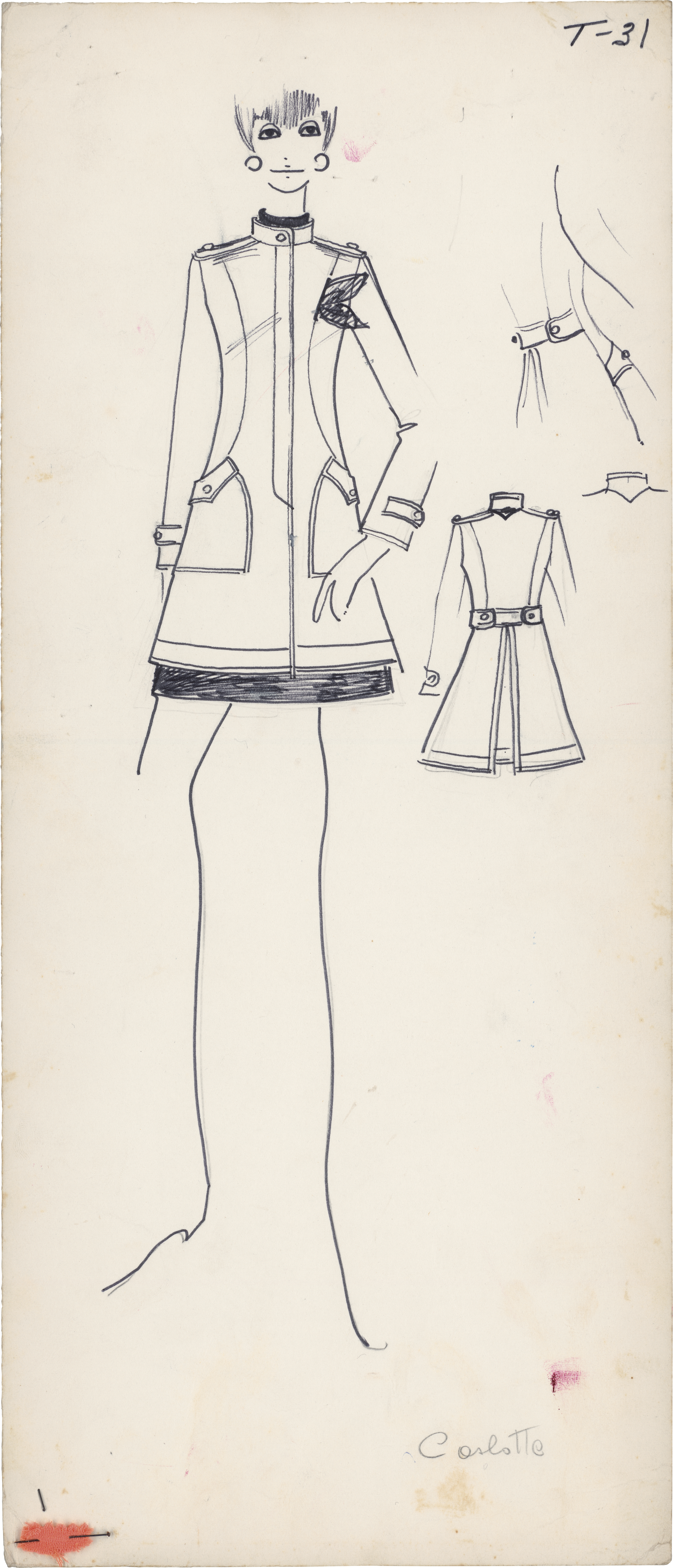 Der Entwurf für einen Kurzmantel stammt aus den 1960er Jahren, als der Couturier für das römische Modehaus Tiziani arbeitete - nach Fendi eine der ersten Stationen seiner strahlenden Laufbahn. Bis 1969 entwarf der spätere Modezar Kleidung für das 1963 gegründete italienische Unternehmen. Tiziani fertigte damals Filmkostüme und Mode u.a. für Elizabeth Taylor an. Das mit Stecknadel befestigte Stoffmuster veranschaulicht die farbliche Umsetzung des Entwurfs.
