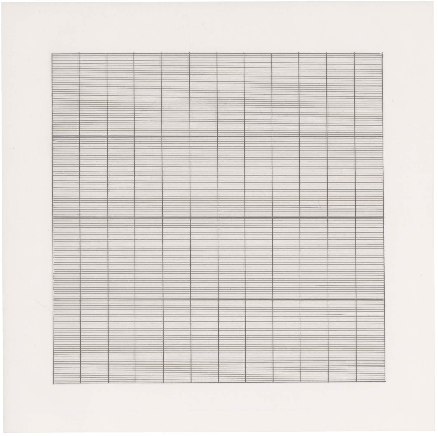 Westliche ästhetische Vorstellungen und östliche Philosophie überlagern sich im kontemplativ wirkenden Schaffen der Künstlerin; Malen war für sie stets auch Bewusstseinsentwicklung. Rhythmik und Stille prägen die feinsinnigen Kompositionen. Die komplette Folge von Lithographien nach Werken von Agnes Martin, alle im von ihr bevorzugten quadratischen Format. Entstanden für die Vorzugsausgabe des Kataloges zur Retrospektive der Künstlerin im Stedelijk Museum, Amsterdam u.a., 1991. Erschienen in der Edition Nemela & Lenzen, Mönchengladbach und des Stedelijk Museum, Amsterdam. Gedruckt bei Nemela & Lenzen in Mönchengladbach. Prachtvolle Drucke mit dem vollen Rand.