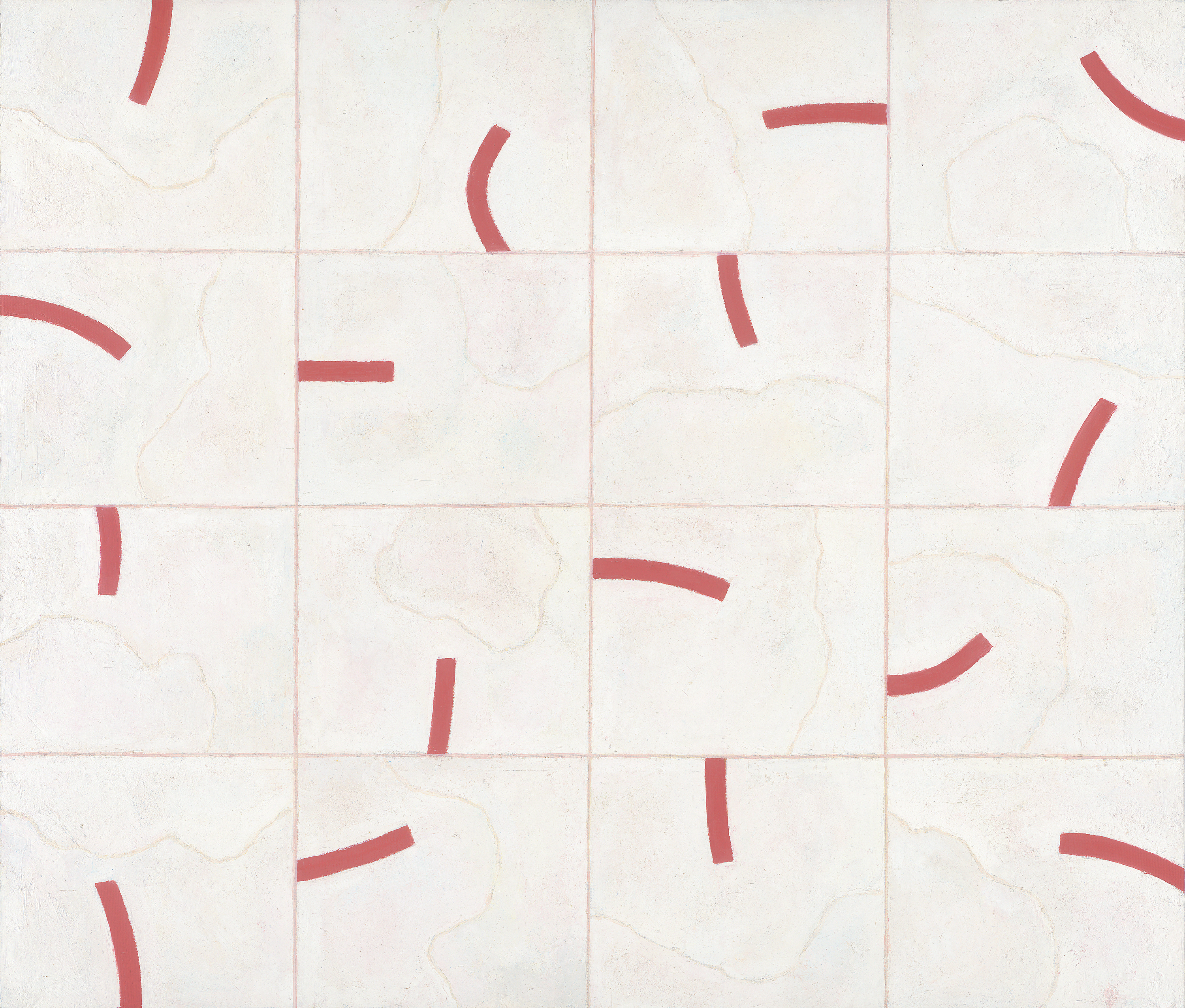 Ein Echo des Einflusses von Malewitsch findet sich in der Grundform des Quadrates, die die reduzierte Komposition prägt. Rote Bogenfragmente in unterschiedlicher Krümmung beleben mit ihrer rhythmischen Anordnung jedes einzelne dieser Quadrate, deren sensibel gestaltete Textur einen Hauch von Rot durch die weißen, bewegten Farbmassen schimmern lässt. Koshin, ausgebildet bei dem Malewitsch-Schüler Wladimir Sterligow in Leningrad, gehörte zu den Mitbegründern des Sterligow-Kreises.