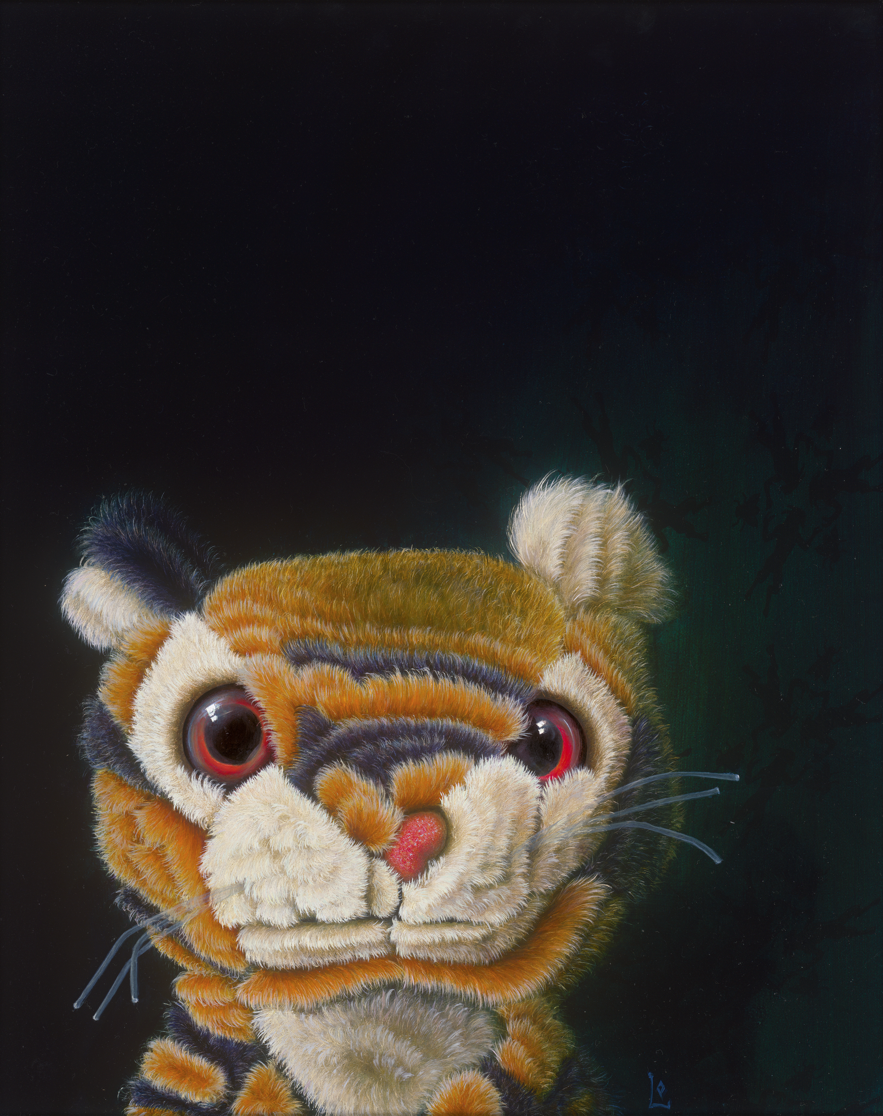Trauriger Tiger, tief im Bild. Portraits von plüschigen Gespenstern bestimmen seit 20 Jahren das malerische Schaffen von Christoph Löffler. Er malt in einer altmeisterlichen Lasurtechnik und sagt selbst über seine Arbeiten: „Ein Paralleluniversum gibt es (…) darin können sich Kinder, genauso wie Künstler verlieren oder wiederfinden - je nachdem. Mit meinen Bildern versuche ich die Grenze durchlässiger zu machen. Deshalb geht es in meiner Kunst auch weniger um Malerei, mehr um Channeling. Die klassische Maltechnik spinnt für mich dabei ein Garn in die Vergangenheit, zum Geheimnis der alten Meister.“ (Christoph Löffler, in: Christoph Löffler. GIFT, Ausst.-Kat. Galerie Franzkowiak, Berlin 2022, S. 1). In seinen aktuellen Werken zieht der Künstler in der Regel eine weitere Bildebene ein, die hier nur als Fragment einer dämonischen Tapete rechts über dem Tigerkopf erscheint und "Jens" eine tragikomische Bedeutung verleiht.