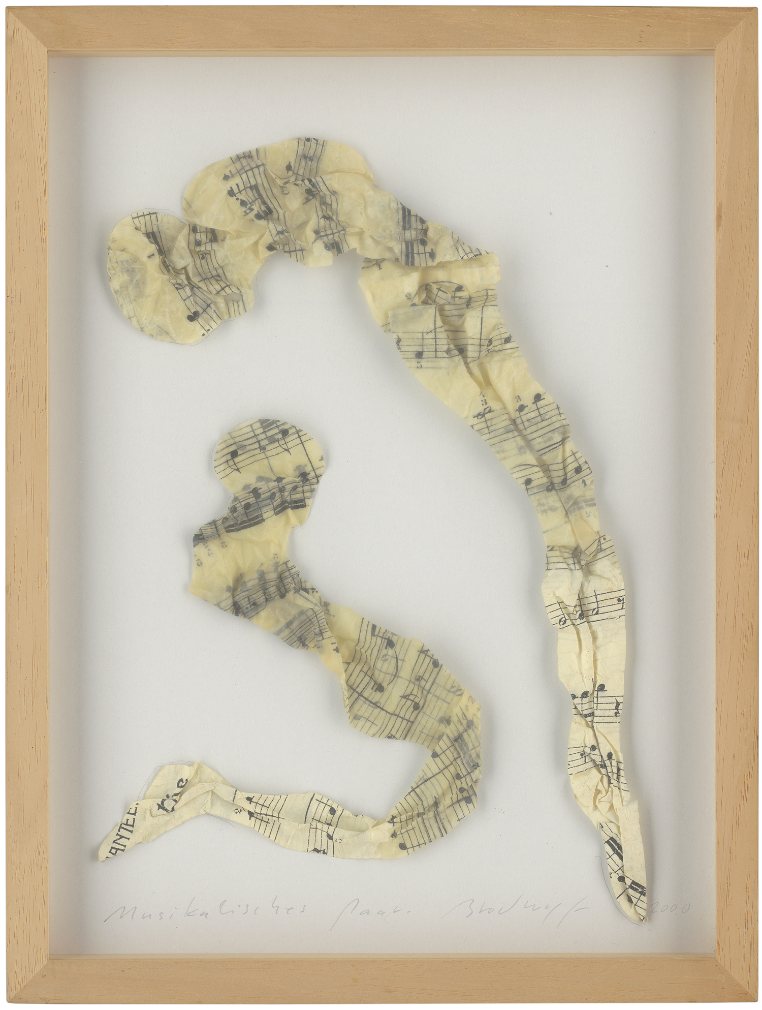 2 Papierfiguren (Notenblätter, geleimt und gefaltet) auf Velinkarton.