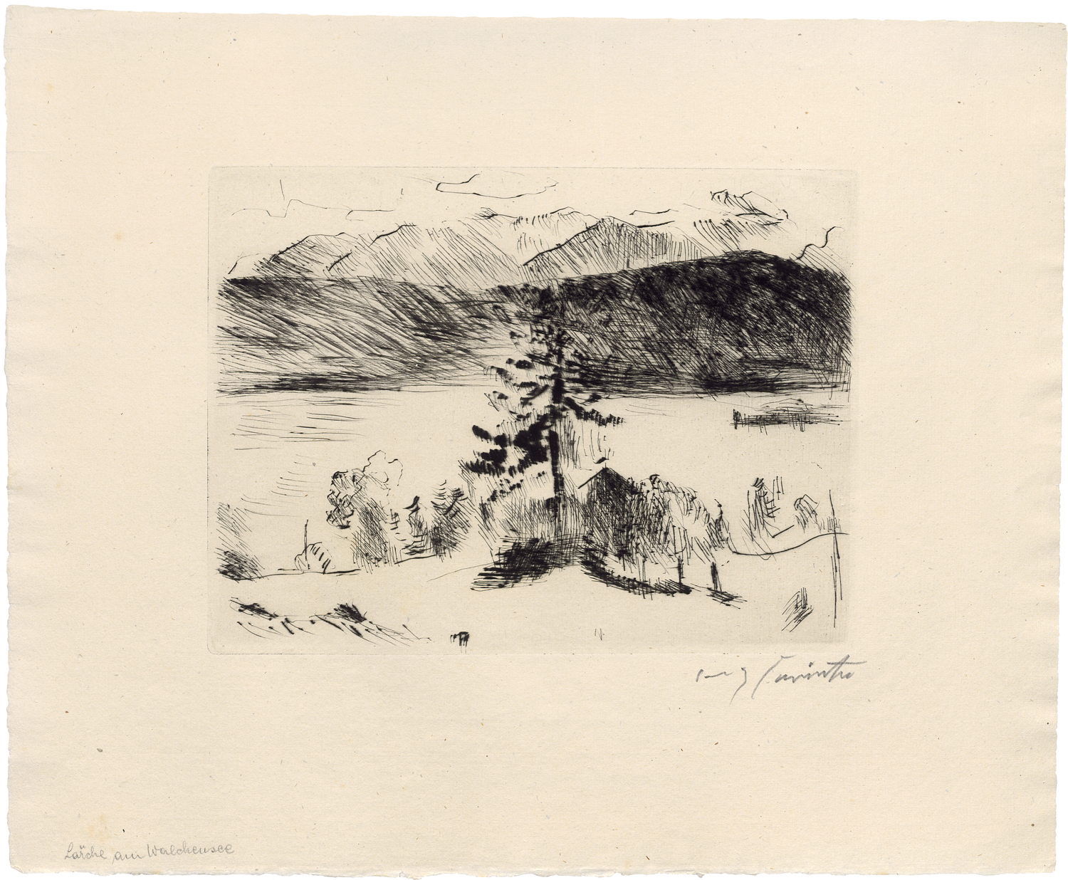 Aus der Folge "Der Walchensee (groß)", deren insgesamt fünf Radierungen aus den Jahren 1919, 1920 und 1923 vermutlich später zu einer Folge vereinigt wurden. Prachtvoller, gratiger und tiefdunkler Druck mit dem wohl vollen Rand, links und unten mit dem Schöpfrand. Beigegeben: Eine weitere Kaltnadel Corinths, "Am Walchensee", 1923 (Müller 674).
