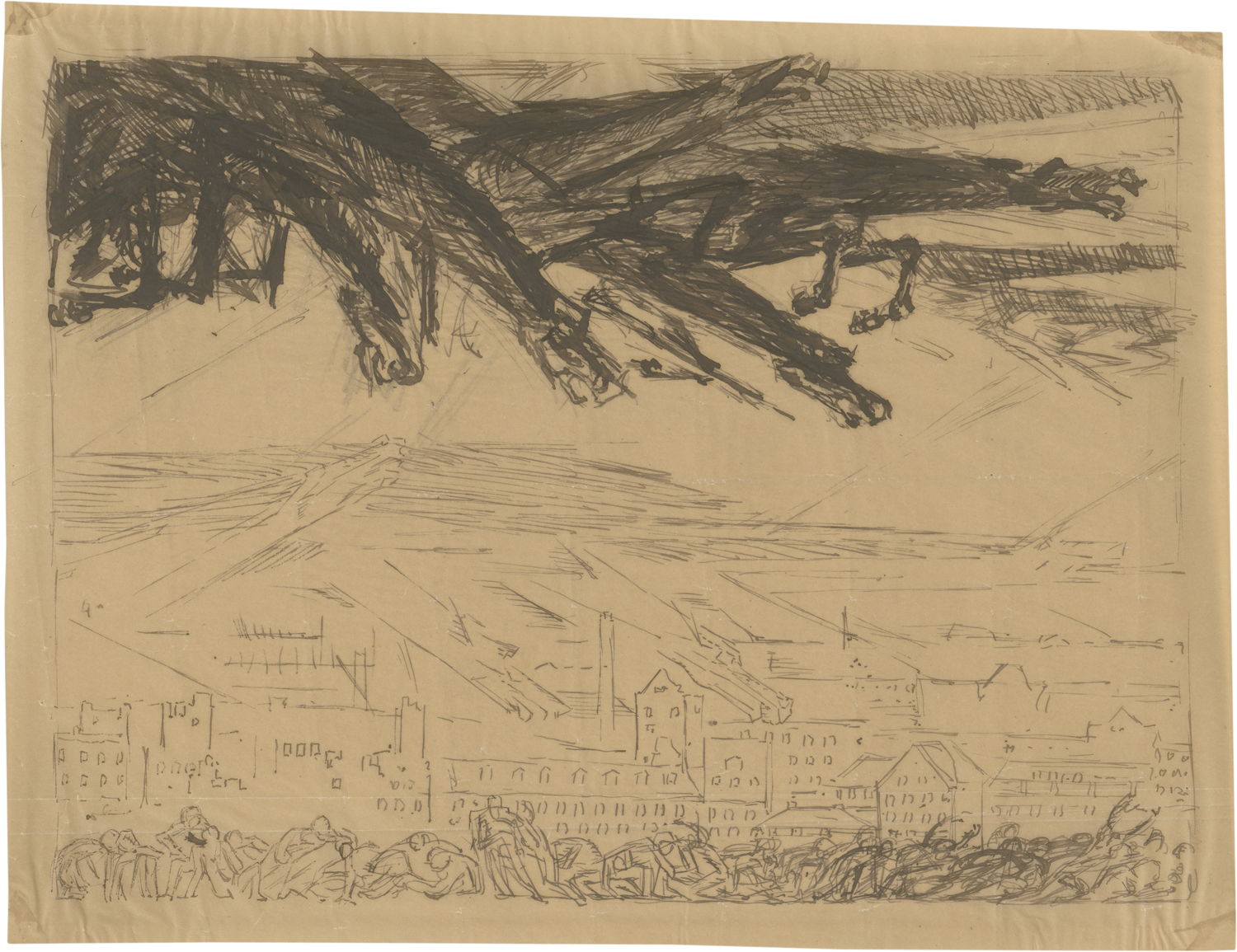 Motivisch vergleichbar mit der Farblithographie "Der Krieg" (vgl. Los 8108), versieht Gering die hier vorliegende Federzeichnung mit dem Titel "Pest" und setzt damit beide einschneidenden Ereignisse der Geschichte zueinander in Beziehung. Inmitten der Kriegswirren von 1916 bezeugt die Arbeit die Auseinandersetzung des gerade 24-jährigen Gering mit dem Tod: Über die Stadt und ihre Menschen hinweg stürmen am Himmel dunkel und bedrohlich die Kriegsrosse.