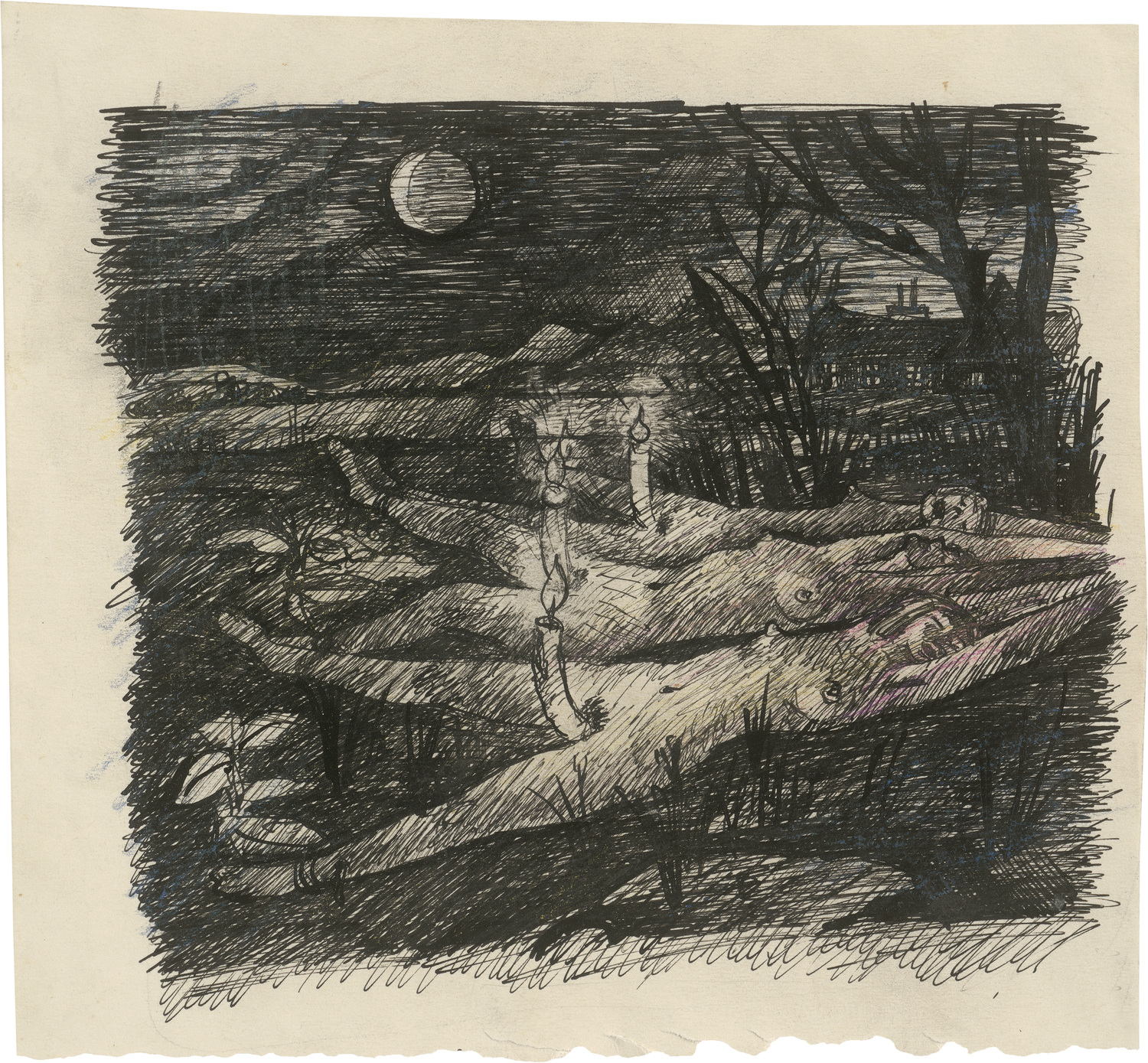 5 Zeichnungen. Feder in Schwarz mit Farbstift bzw. Aquarelle auf verschiedenen Papieren. Um 1929.