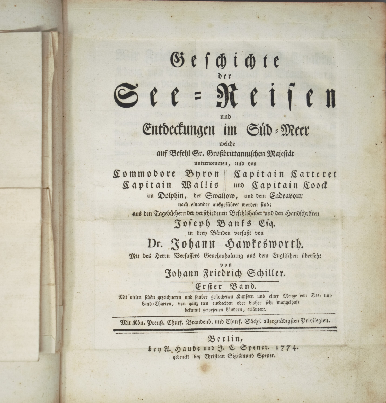 Hawkesworth, John. Geschichte der See-Reisen und Entdeckungen im Süd-Meer. Aus dem Englischen übersetzt von Johann Friedrich Schiller. 3 Bände. Mit 64 zumeist gefalteten oder doppelblattgroßen Kupfertafeln und -karten. 25 x 20,5 cm. Marmorierte Lederbände d. Z. (berieben, Rücken nachgedunkelt) mit floraler RVergoldung (diese mit Fehlstellen) und goldgeprägtem RSchild. Berlin, Haude und Spener, 1774.