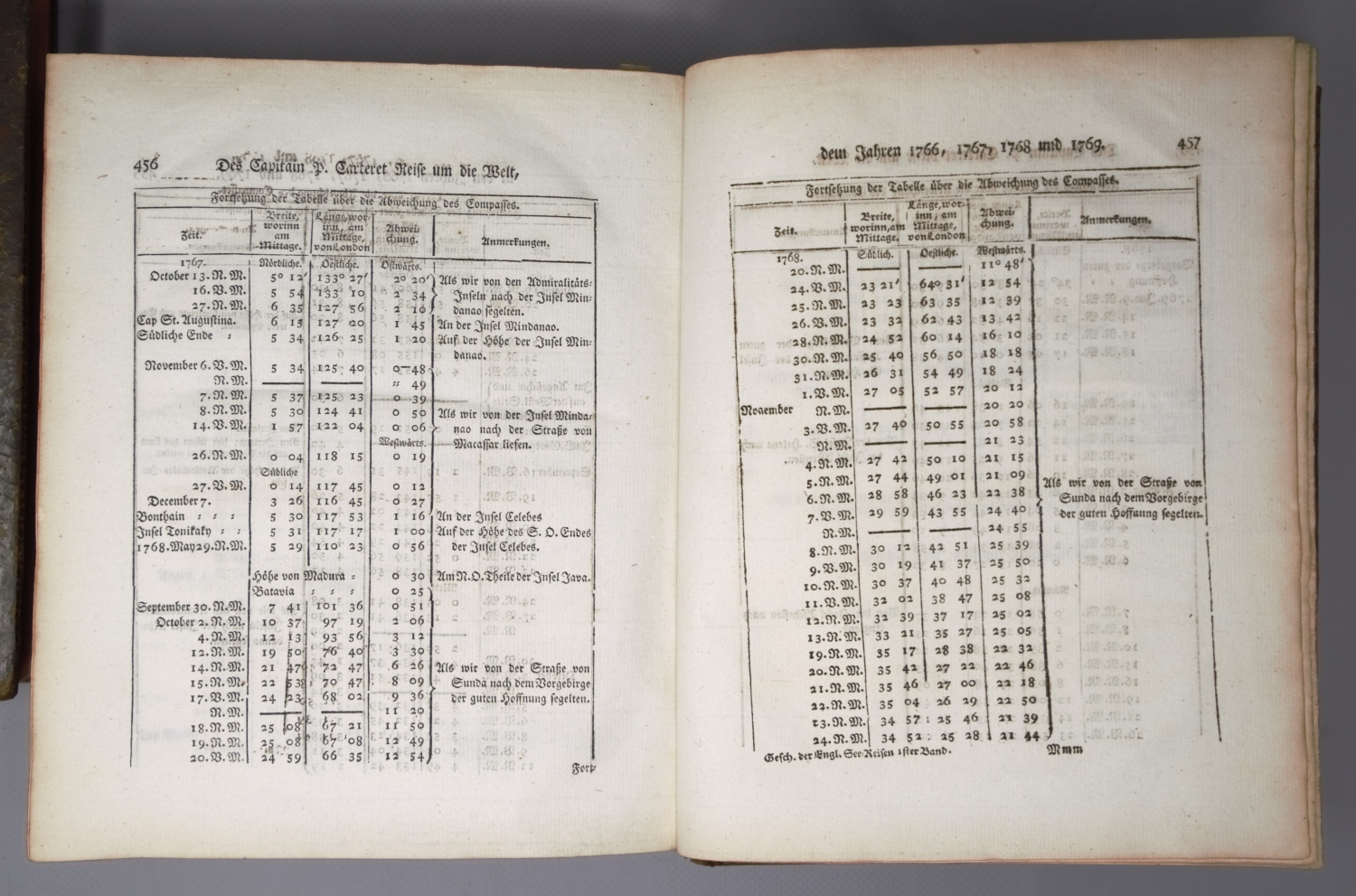 Sabin 30942. Cox I, 19f. Hocken S. 19. Engelmann I, 98. Goedeke IV/1, 620 f., 102, 1. Griep-Luber 494. – Erste deutsche Ausgabe der Beschreibung verschiedener Expeditionsreisen in die Südsee. Enthält Beschreibungen der Reisen von Carteret, Byron, Wallis (Band I) sowie Cooks erster Weltreise auf der Endeavour 1768 bis 1771 (Bände II und III) in der Zusammenfassung durch den Journalisten John Hawkesworth, die auf den Tagebüchern und Berichten von Joseph Banks basiert. Die Kupfer zeigen neben Karten, Plänen und Ansichten die Eingeborenen mit ihren Haartrachten und Bekleidungen, Lebensgewohnheiten, Behausungen und Gerätschaften, Schiffen u. v. a. – Etwas fleckig, wenige Falttafeln mit unbedeutenden, teils hinterlegten kleinen Randeinrissen, eine Tafel stärker gebräunt. Insgesamt wohlerhalten.